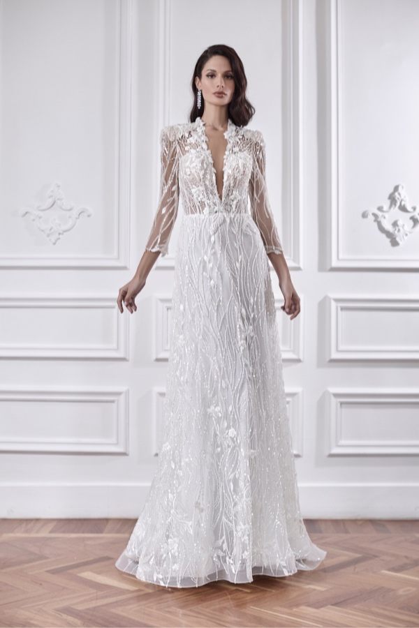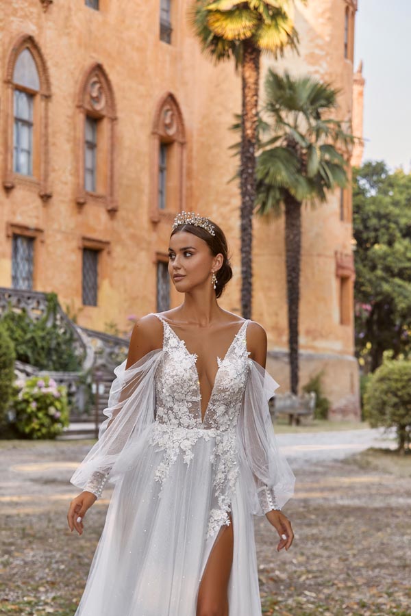 Le sue caratteristiche lo rendono una scelta intramontabile: la linea pulita e i dettagli delicati, come le maniche in pizzo o le spalline sottili arricchite da perline, lo trasformano in un abito su misura per ogni sposa.